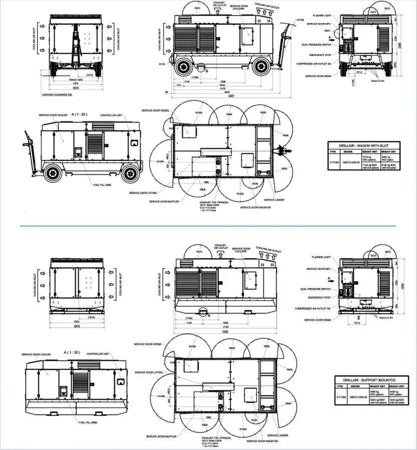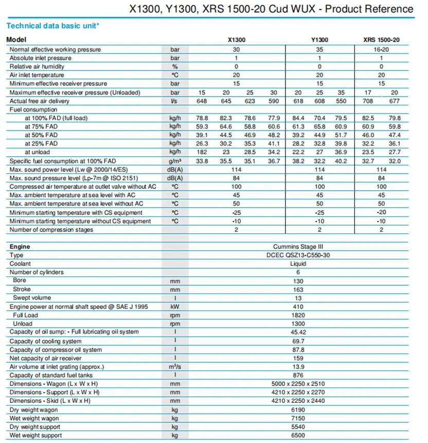 Atlas Copco X1300, Y1300 ve XRS 1500-20 sessiz, iki kademeli, yağ enjeksiyonlu vidalı kompresörlerdir ve gücünü sıvı soğutmalı, altı silindirli Cummins dizel motordan alır.