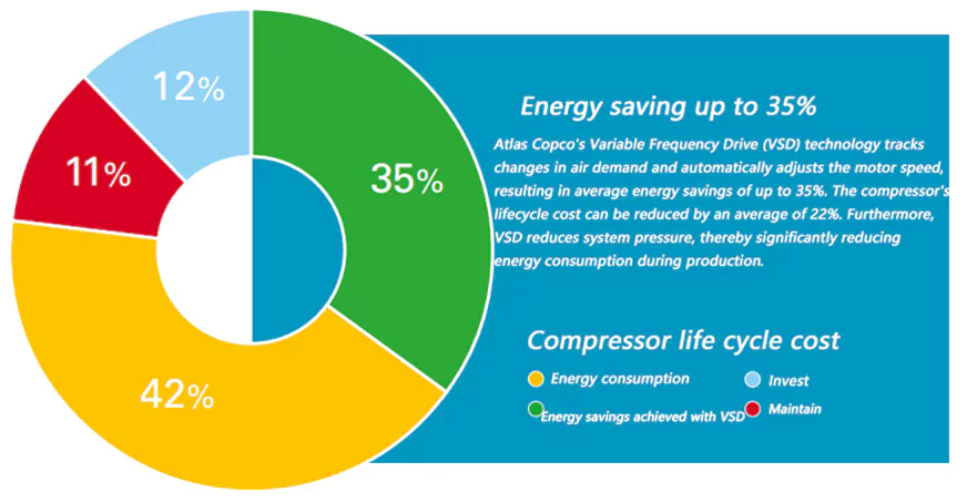Enerji tüketimi, Yağsız Vidalı Hava Kompresörünün toplam kullanım ömrü maliyetinin %80'inden fazlasını oluşturur. Ayrıca basınçlı hava üretiminde kullanılan elektrik, bir fabrikanın toplam elektrik maliyetlerinin %40'ından fazlasını oluşturmaktadır. Atlas Copco, enerji maliyetlerini azaltmak amacıyla basınçlı hava endüstrisinde Değişken Frekanslı Sürücü (VSD) teknolojisine öncülük etti. VSD yalnızca önemli miktarda enerji tasarrufu sağlamakla kalmaz, aynı zamanda gelecek nesiller için çevreyi de korur. Atlas Copco, bu teknolojiye sürekli yatırım yapması sayesinde piyasadaki en geniş entegre VSD kompresör yelpazesini sunabilmektedir.