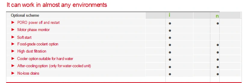 Kompresörlerimiz gıda sınıfı soğutucular, yüksek toz filtreleme ve sert su soğutucuları ve zorlu ortamlara uyarlanmış, çoklu uygulama ihtiyaçlarınızı karşılayabilecek diğer seçenekler sunar.