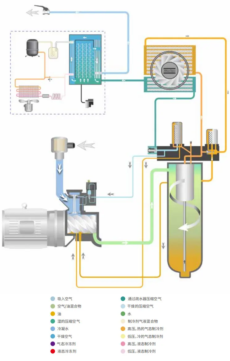 ·Son soğutucudaki su ayırıcı temel olarak suyu uzaklaştırabilir. Otomatik drenaj sağlamak ve basınçlı hava kaybını azaltmak için standart olarak elektronik bir drenaj vanasıyla birlikte gelir.