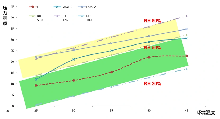 Aşağıdaki ölçülen verilerde gösterildiği gibi, 7 Bar basınçlı hava giriş basıncı, 35°C giriş sıcaklığı, 7°C basınç yoğuşma noktası ve 25°C nihai egzoz sıcaklığı ile havanın bağıl nemi %30 olup boru hatlarının ve hava kullanan ekipmanların korozyonunu etkili bir şekilde önler.