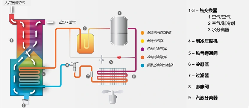 Atlas Copco F tipi soğutmalı hava kurutucuda hava/hava, hava/soğutucu akışkan ve su ayırıcılarını birleştiren üçü bir arada ısı eşanjörü bulunur. Bu, soğutma sonrasında ayrılan sıvı suyu etkili bir şekilde uzaklaştırır ve basınçlı havayı önceden soğutarak ısı değişim verimliliğini artırır. Eş zamanlı olarak, kurutulmuş basınçlı havayı giriş sıcaklığından 10°C daha düşük bir sıcaklığa ısıtır, işlemden sonra basınçlı havanın bağıl nemini %50'nin altında olmasını sağlar, korozyonu önler ve soğutmalı hava kurutucusunun gerçek dehidrasyon etkisine ulaşır.